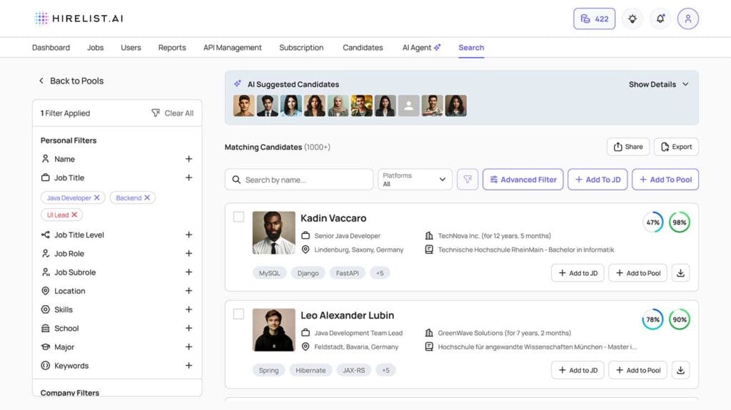 Drawing from a vast network of platforms and databases, HireList.ai’s AI agents find the best-fit candidates faster, saving you hours of manual searching.