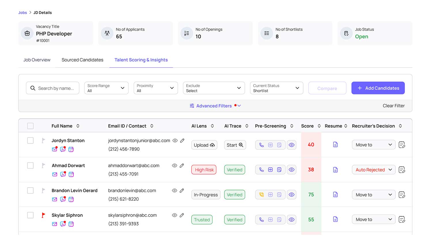 AI Lens for document verification and seamless integration with HR systems streamlines the entire screening process.